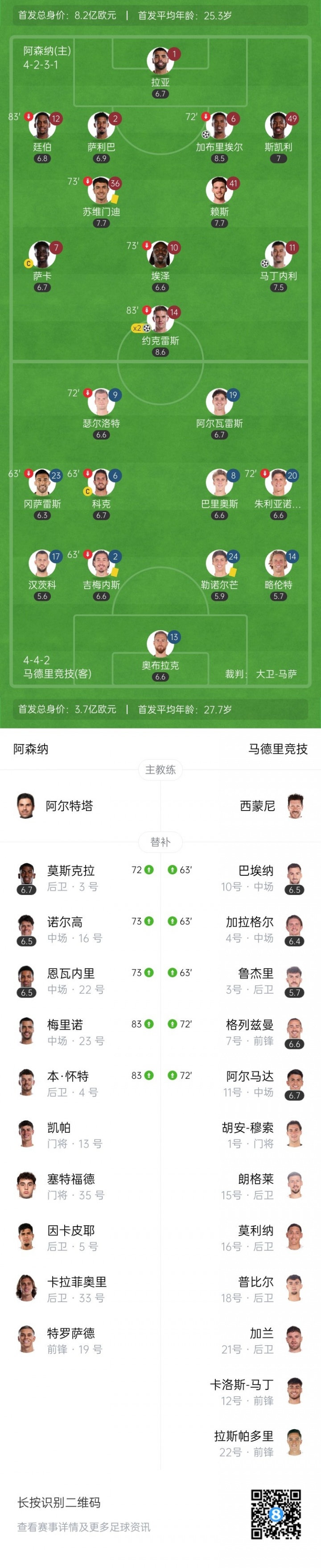 战术鬼才⁉️西蒙尼第63分钟连换3人,随即7分钟丢3球被枪手打崩